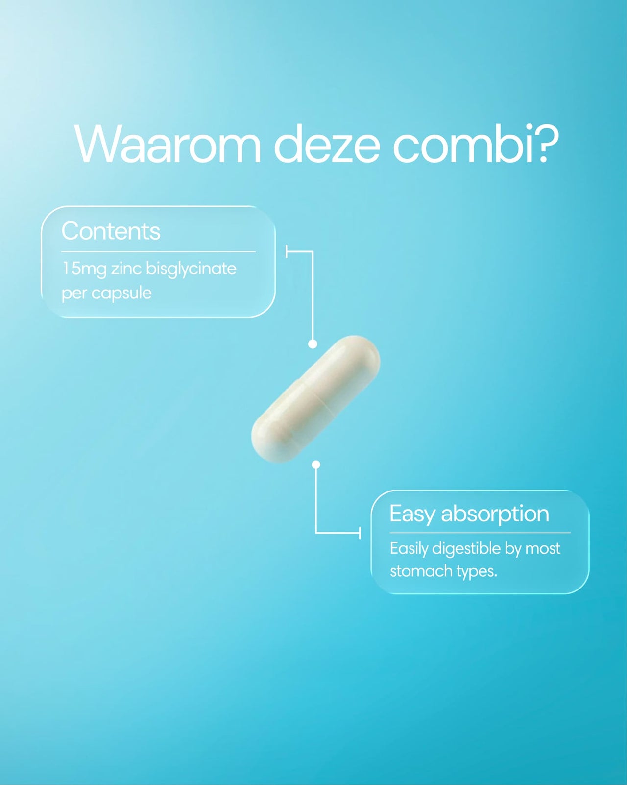 Zinc bisglycinate is a form where zinc is bound to the amino acid glycine. Your body absorbs this type of binding more easily, using a separate channel in the intestine. This way the zinc reaches the right place more quickly and effectively. It is also gentle on the stomach and can easily be taken with a meal.