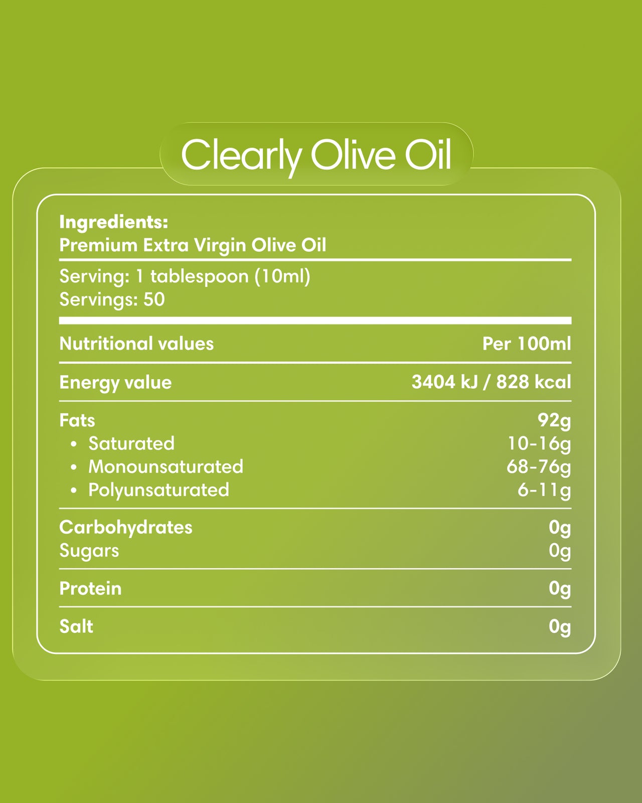 The acidity level is an indicator of olive oil quality. Extra virgin olive oil has a low acidity level, which means the olives are of high quality and the oil hasn’t been degraded by oxidation or fermentation. The lower the acidity, the better the taste and quality of the olive oil. Clearly Extra Virgin Olive Oil has an exceptionally low acidity of just 0.19%, which contributes to its flavor and purity.