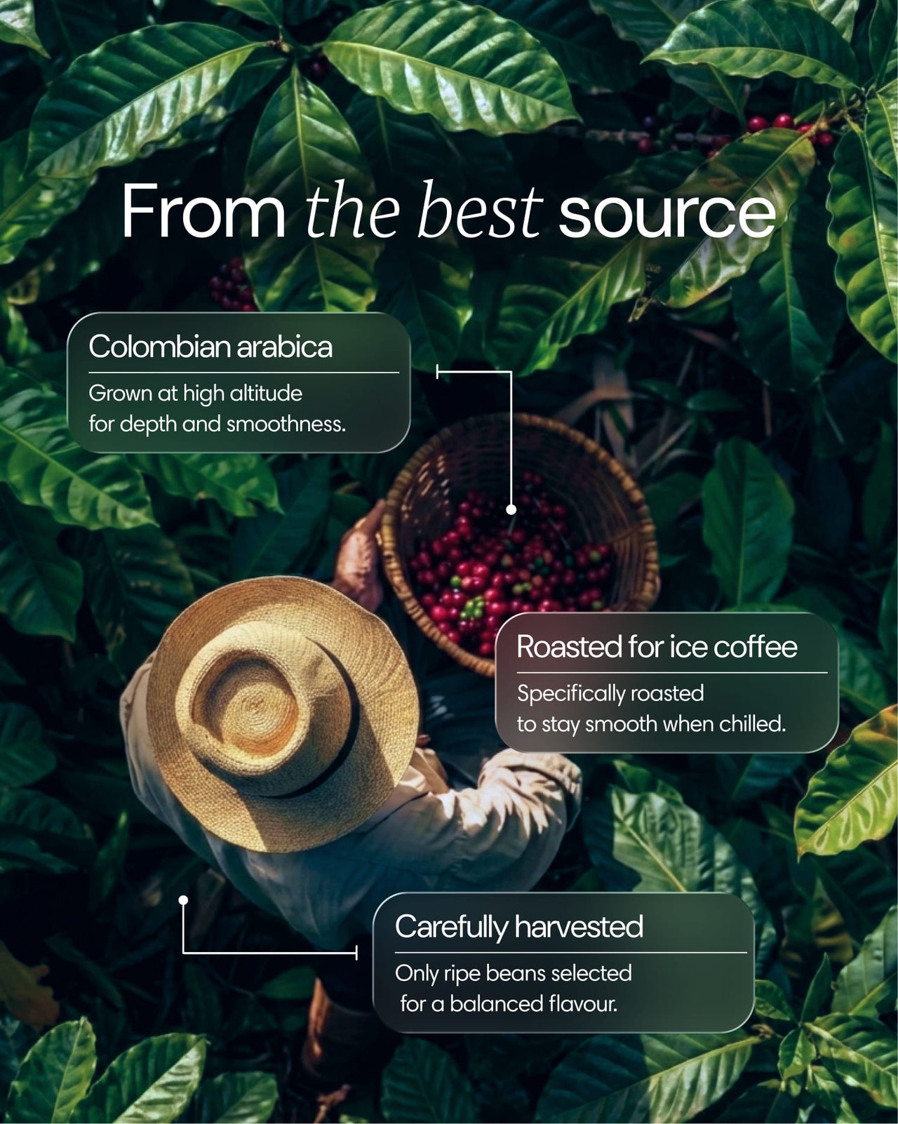 Each serving contains 35–45 mg of caffeine, depending on the variant. That’s about half the amount of a regular cup of coffee. For Decaf, we use the same Colombian arabica beans, but with almost all caffeine removed.
