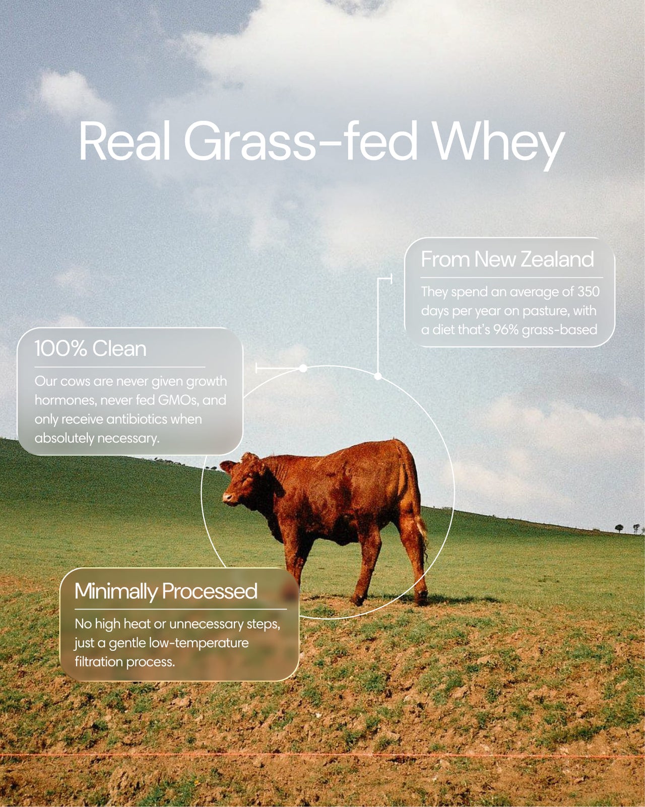 Most whey comes from cows that spend much of their lives indoors and are fed grain-based diets. Our whey comes from New Zealand, where the cows graze outdoors at least 350 days a year, with a diet of at least 96% grass. This way of farming not only results in cleaner, higher-quality protein but also ensures far better animal welfare.